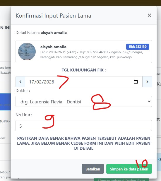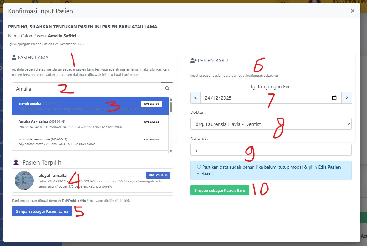 - Cek pasien, dengan cara ketik nama pasien yang mirip