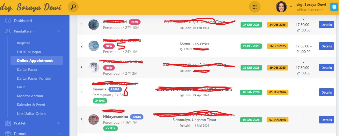 - Jika anda curiga pasien online yang mendaftar sebagai pasien baru ternyata adalah pasien lama, maka anda fokus di panel ini (kiri)