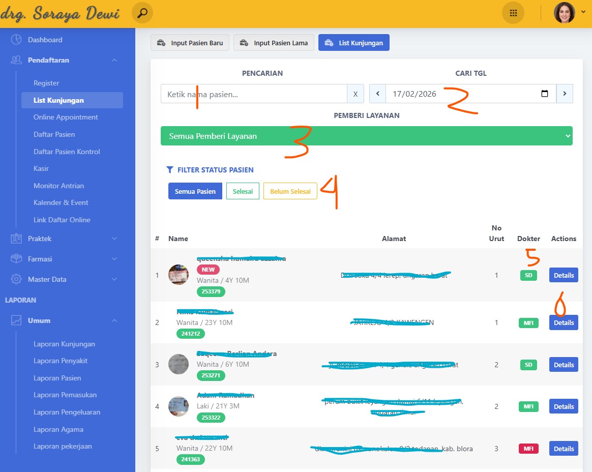 - pada kolom dokter pemberi layanan bisa berwarna orange (belum diperiksa), merah (sedang diperiksa) dan hijau (sudah diperiksa)
