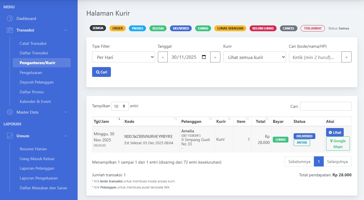 • Gunakan filter Kurir untuk memonitor performa masing-masing kurir per hari (berapa transaksi, total pendapatan).