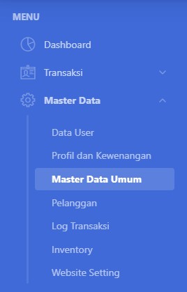 Anda dapat mengakses fitur input master data melalui menu Master Data > Master Data Umum pada sebelah kiri layar, kemudian pilih tab yang diinginkan (layanan, bahan, metode pembayaran, pelanggan dan Settings) tentunya login sebagai akun pemilik.